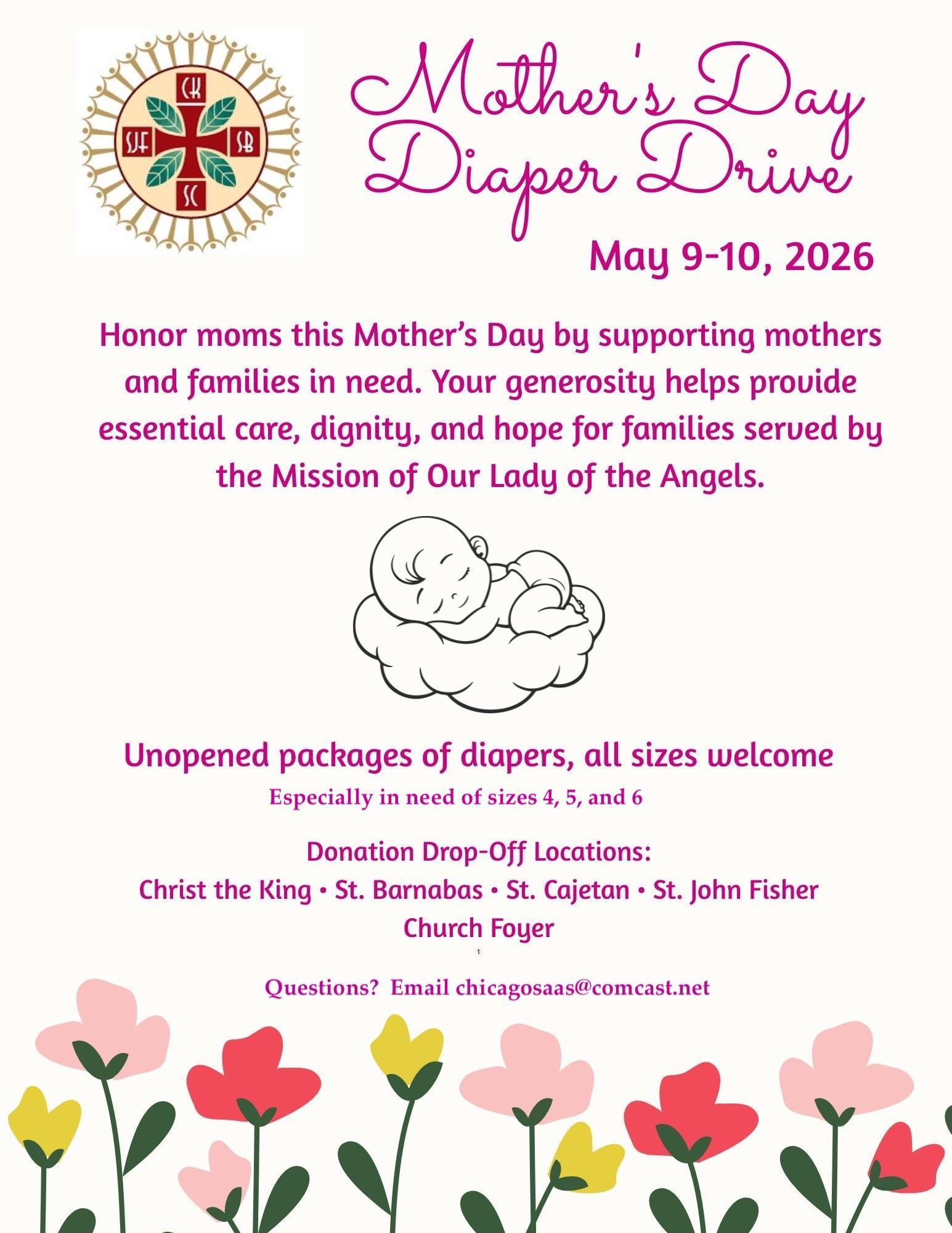 The SPR Service Committee invites you to support its Mother’s Day Diaper Drive on May 9-10. Diapers of all sizes can be dropped off in the foyer of the church. Your generosity will provide compassion and respect to the families served by the Mission of Our Lady of the Angels.